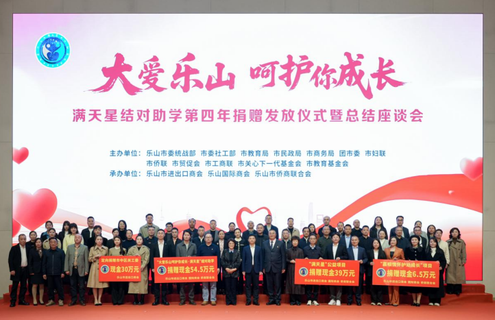 “满天星结对助学”由乐山市进出口商会、国际商会、侨商联合会发起并已连续开展四年,已覆盖105所学校,筹集发放助学金及物资总价值达828万元,精准帮扶了全市多个区县家庭经济困难群众27000余人次,形成了良好的品牌效应和社会影响力。本次捐赠仪式暨总结座谈会的成功举办,不仅为四年的助学活动画上了一个圆满的句号,更开启了政企社携手、同心助力教育事业与城市高质量发展的新征程。