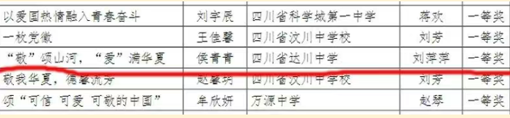 在四川省教育科学研究院主办的第三届“可信、可爱、可敬的中国”中小学师生爱国主义教育主题活动中,达川中学16名学子从众多参赛者中脱颖而出,获省级特等奖3人、一等奖1人、二等奖12人,充分展示了川中学子深厚的家国情怀与综合素养。
