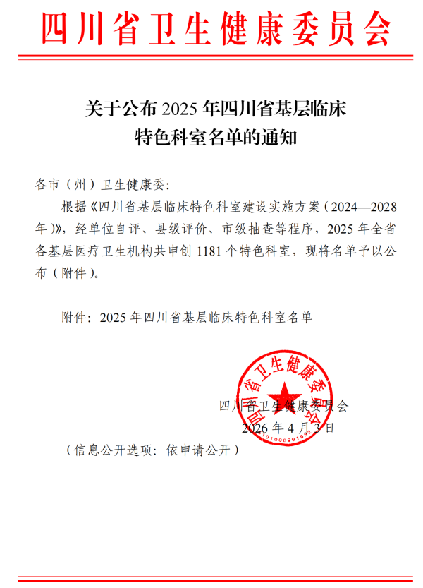 近日,四川省卫生健康委员会正式发布《关于公布2025年四川省基层临床特色科室名单的通知》。达川区三里坪街道社区卫生服务中心的“康复医疗服务”历经单位自评、县级评价、市级抽查等层层严格审核,成功申创为2025年四川省基层临床特色科室。