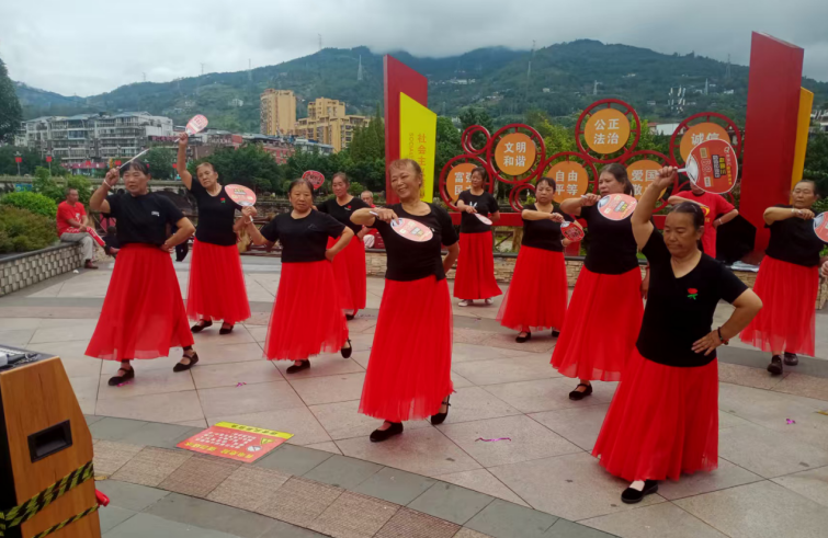 活动在《歌唱祖国》歌声中拉开序幕。随后,跳起了腰鼓舞《中国范儿》、扇子舞《梦里梦》、斗蓬舞《农民辛苦了》、广场舞《手心有你》等节目。用歌舞祝福我们伟大的祖国明天更加美好。