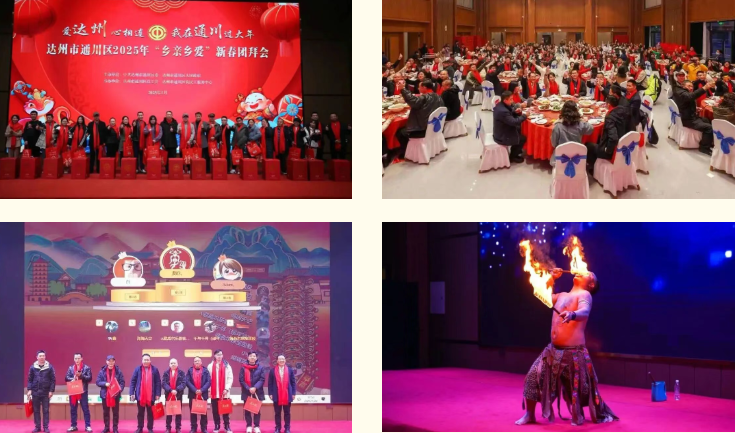 1月23日,通川区举办“爱达州 心相连 我在通川过大年”新春团拜会,200余名返乡乡友欢聚一堂。团拜会以通川宣传视频、欢快舞蹈拉开序幕,歌曲演唱、特技表演及抽奖活动轮番上演,现场张灯结彩,喜庆氛围浓厚。随后的团年饭摆满通川特色美食,乡友们围坐交流,分享工作生活趣事,畅谈家乡发展变化。活动现场为返乡乡友发放新春慰问礼包200余份,传递区委、区政府及工会组织的浓浓关怀。此次团拜会搭建起乡友交流互动平台,让大家感受到家乡温暖,凝聚起助力通川经济社会发展的奋进力量。