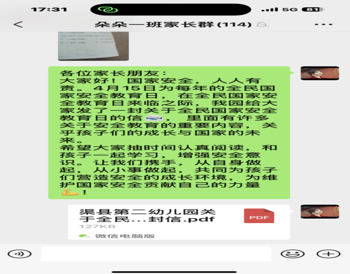 在家长群向家长发放全民国家安全教育日致家长的一封信,信中介绍了国家安全的重要性、常见的危害国家安全的行为以及家长如何在日常生活中引导孩子树立国家安全意识等内容。同时,鼓励家长与孩子一起学习国家安全知识,通过亲子互动,增强家长和孩子的国家安全意识,形成家园共育的良好局面,将国家安全教育从校园延伸到家庭,扩大活动的影响力。