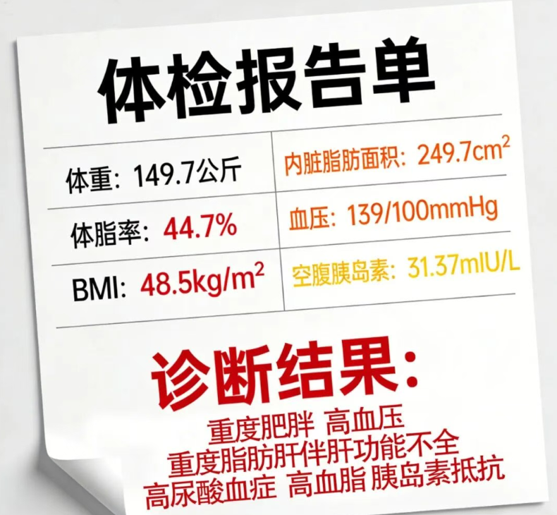 杜先生从小就胖,20岁达到体重最高点149.7kg,但他一直没放在心上。直到2024年1月,他收获了一份令人担忧的体检结果: