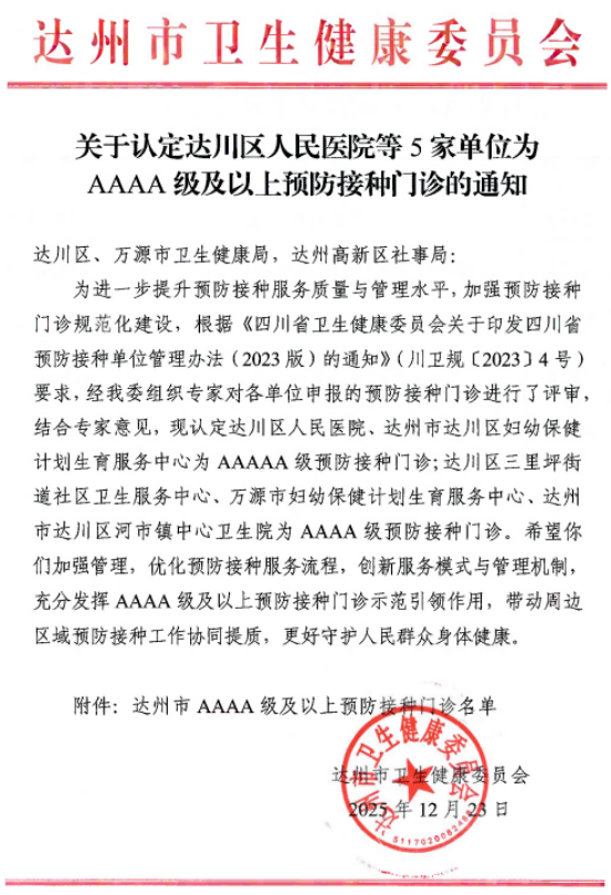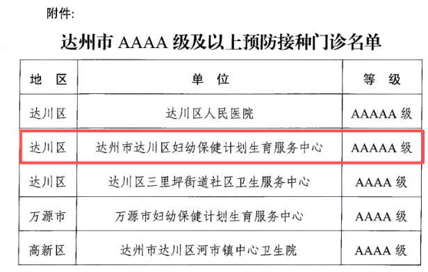 达州市达川区妇幼保健院预防接种门诊获评“AAAAA级门诊”