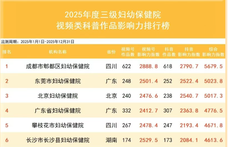 本次评选由国家卫生健康委妇幼健康中心组织开展,对全国三级妇幼保健院的官方抖音号、微信视频号发布的科普作品进行年度影响力监测,数据覆盖2025年1月1日至12月31日。全国共有285个抖音号、326个视频号参与角逐。