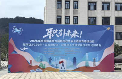 为抢抓春季求职招聘黄金窗口期,全力拓宽高校毕业生就业择业渠道,4月22日,“职引未来——2026年全国城市联合招聘高校毕业生春季专场活动暨翠屏区2026年‘三长进校园’成都理工大学宜宾校区专场招聘会”在成都理工大学宜宾校区校训广场成功举办。本次活动由中共宜宾市翠屏区委组织部(人才办)、翠屏区人力资源和社会保障局、宜宾三江新区社会事业局、成都理工大学宜宾校区联合主办,多方聚力、政企校协同,将优质岗位与暖心服务送到校园门口,助力毕业生就近就地高质量就业。