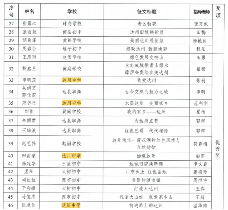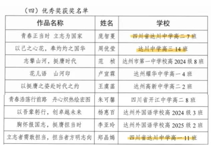 硕果盈枝缀满园,捷报频传奏凯歌! 在这个洋溢着收获与喜悦的季节里,我们怀着无比激动的心情,向全体师生、家长以及长期关心支持达川中学发展的社会各界人士报喜! 近日,从国家、市、区各级各类作品征集活动接连传来佳音,达川中学师生凭借出色的才华、独特的创意与不懈的努力,一路“披金斩银”,成绩斐然,捷报频传! 无论是文学创作的锦绣篇章,还是艺术创作的匠心硕果,都得到了评委专家们的高度认可,充分展现了达川中学师生卓越的综合素养与昂扬的精神风貌。 【一】 西南林业大学承办的第五届“智华杯”全国艺术作品竞赛最近公布了获奖作品,川中学子书法作品在众多参赛作品中脱颖而出,其中:作品《风度山横联》斩获银奖,《题邓爱慕》、杜牧《江南春》两件作品喜获佳作奖,赵庭老师荣获“优秀指导教师”。 祝贺以上获奖师生!让我们一同为学子们的才华喝彩,也祝愿同学们在艺术熏陶中汲取向上的力量! 【二】 达州市首届中小学生最美散文、诗歌作品征集大赛近日公布了获奖名单,达川中学共有10件作品获奖,其中,一等奖1个,二等奖1个,三等奖2个,优秀奖4个,入围奖2个,毕素琼、唐鑫、唐丽、文春梅四位老师获得“优秀指导教师”称号,达川中学获得“优秀组织单位”。 据悉,本次活动由四川文理学院、达州市关心下一代工作委员会、达州市教育局、共青团达州市委、达州市融媒体中心主办,由巴山作家群研究院、四川省青少年文学艺术社科普及基地、达州晚报教育周刊、达州市达报教育管理有限公司承办,旨在发展我市校园散文诗歌文化,传承弘扬我市优秀传统文化,进一步选拔和培养优秀文学人才,提升我市青少年文化艺术水平。活动开展以来,川中学子热情参与,积极投稿,取得了良好的成绩。在此向所有获奖同学致以最热烈的祝贺!也向辛勤指导的老师表示衷心感谢! 诗心不熄,创作不止。期待更多川中学子提笔书写属于你们的璀璨篇章! 【三】 在中共达州市委教育工作委员会和达州市教育局组织的“立报国强国大志向,做挺膺担当奋斗者”主题征文比赛活动中,达川中学共有6名师生获奖,其中,庞智蔓、周优莹、郑晶嫣三位同学的作品分别获得了优秀奖,庞艳老师的《粉笔为楫渡星河:一名中学班主任教师的时代答卷》获得一等奖,何春梅老师的《鹰扬万里凌云际,志报家国正当时》获得二等奖,唐娅老师的《指尖上的红色旋律:在达州红土奏响育人华章》获得优秀奖。 【教师组】 祝贺获奖老师和同学! 字字见肝胆,篇篇显风华。川中人用笔书写祖国的精彩篇章,用行动践行“强国有我” 的铮铮誓言! 【四】 达州市达川区教育局等4部门公布了关于“颂优美环境 展老区新貌”征文大赛评奖结果,达川中学有4件学生作品获得优秀奖,学校在本次活动中也获得优秀组织奖。 祝贺以上获奖同学!你们用真情实感表达的不仅仅是对老区新貌的赞美,亦是浓浓的家国情怀与民族自豪感! 老家达县,宜美达川。青山绿水风光好,还历史悠久、底蕴深厚,在新时代焕发新气象。 这些沉甸甸的荣誉,是同学们勤学苦练的智慧结晶,是老师们悉心指导的丰硕成果,更是达川中学坚持“五育并举”、全面育人的生动体现!