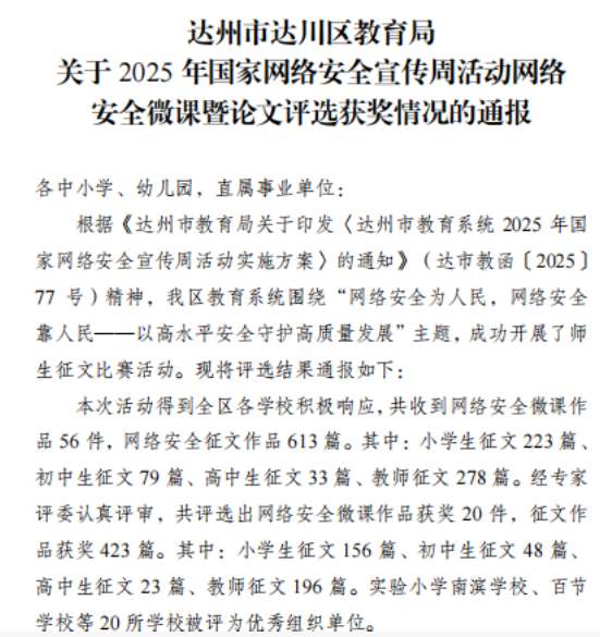 达川中学师生在区2025年国家网络安全宣传周活动中喜获佳绩