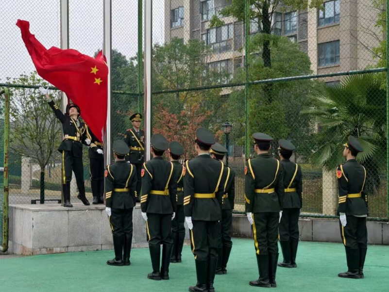 在雄壮的国歌声中,五星红旗冉冉升起,全体师生肃立行注目礼,少先队员行队礼,表达对祖国的无限热爱与崇高敬意。