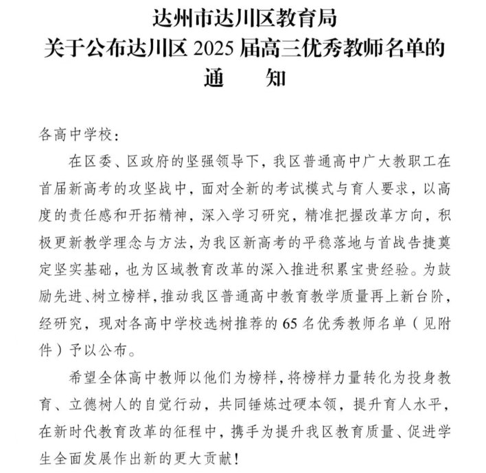 近日,达州市达川区教育局公布了“达川区2025届高三优秀教师”名单,四川省达川中学共有11位教师喜获表扬。 荣获表扬的教师分别是:唐玉珍、易盼、侯莉、兰红川、黄丽丽、曾靖、魏燕妮、白晓娟、杨莉、吴显胜、杨李。 在新高考改革全面落地的关键之年,他们面对全新模式与要求,以高度的责任感和开拓精神,深入钻研改革政策,精准把握教学方向,积极更新教育理念,不断优化教学方法。他们以扎实的学识、辛勤的付出和无私的奉献,为学生成长护航,为学校发展助力,更为全区新高考平稳实施、首战告捷奠定了坚实的基础,贡献了“川中”力量。 在此,向以上获奖教师表示最热烈的祝贺! 希望全体教师以他们为榜样,见贤思齐,不断提升教育教学水平,共同锤炼育人本领。让我们携手并肩,继续发扬追求卓越、勇于担当的精神,为持续提升学校办学品质、推动教育教学高质量发展作出更新更大的贡献!