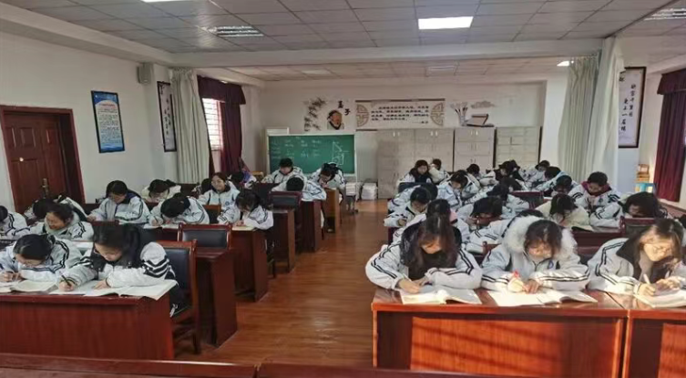 年级决赛赛场设于凌云阁,现场气氛紧张而热烈。来自各班级的优秀选手齐聚一堂,在规定时间内完成指定内容的书写。两位监考老师端坐台前,严格把控比赛过程,保障赛事公平有序。